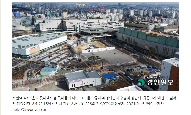 KCC몰이 착공되면 하루 평균 유동인구 40만명인 수원역에 AK타운, 롯데백화점·롯데몰에 이어 3번째 대형 유통업체가 등장하는 셈이다.