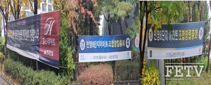 이 단지는 한때 건설사들이 설치한 현수막으로 도배됐지만, 지금은 ‘빠른 사업추진과 성공을 기원한다’는 문구를 적은 현대건설의 현수막과 ‘조합창립총회를 축하한다’는 포스코건설, 코오롱글로벌의 현수막만 걸려있다. 주택조합 추진위에서 미관상의 이유로 현수막을 떼낸 것이다. 김 위원장은 “예전엔 아파트 단지 내 설치된 현수막이 많았는데, 이곳에 세입자분들도 많아 미관상 일부 현수막은 제거했다”고 말했다.