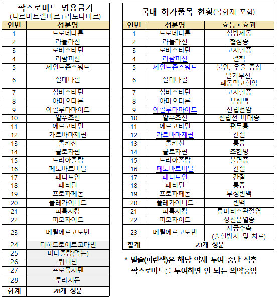 화이자 팍스로비드와 함께 복용하여서는 안되는 의약품은 아미오다론 등 28개 성분이고, 이 중 국내 허가가 있는 의약품 성분은 23개임. [사진=보건복지부]