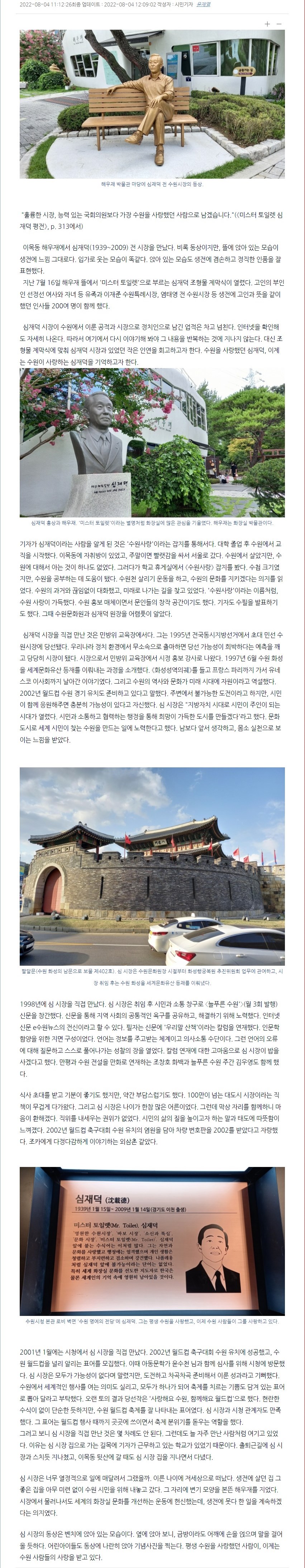 | [김우영 광교칼럼] ‘미스터 토일렛 심재덕’, 세월이 흘렀어도 그립습니다- 김우영 논설위원 / 시인 (0) | 2022.07.20 |