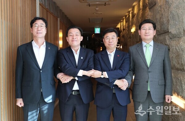 4개 도시 시장들이 8일 3호선 연장사업 공동추진을 위해 오찬을 가진 뒤 기념촬영을 하고 있다. 왼쪽부터 정명근 화성시장, 이재준 수원특례시장, 신상진 성남시장, 이상일 용인특례시장. (사진=수원시)