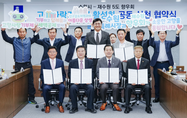 이재준 수원시장과 재수원 강원도민회·충청도민연합회·호남향우회·영남향우회·제주도민회장은 이날 시청 상황실에서 ‘고향사랑기부제 활성화를 위한 공동실천협약’을 체결하고, 상생협력을 약속했다.