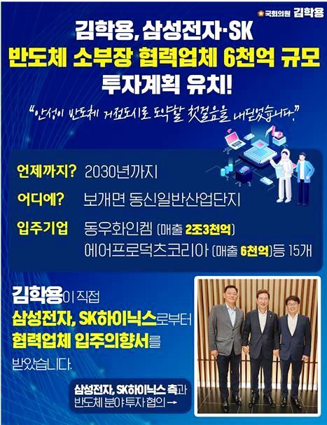 김학용이 직접 삼성전자, SK 반도체 핵심 협력업체의 6천억 규모 투자계획을 이끌어 냈습니다. 안성이 반도체 거점도시로 도약하는 첫걸음을 내딛었습니다.