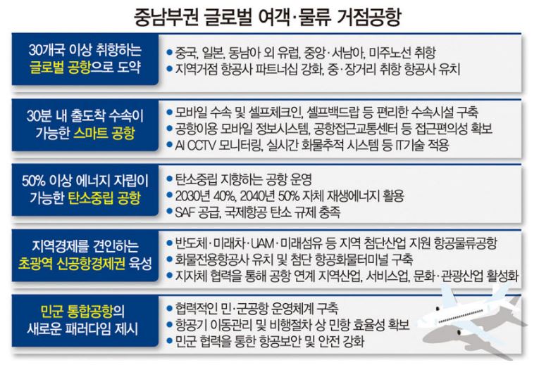세부적으로는 △유럽, 미주 노선 등 30개국 이상 취항하는 글로벌 공항 도약 △ 30분 내 출도착 수속이 가능한 스마트 공항 △50% 이상 에너지 자립이 가능한 탄소중립 공항 추진 △초광역 신공항 경제권 육성 △민군 통합공항의 새 패러다임 제시 등이 제시됐다.