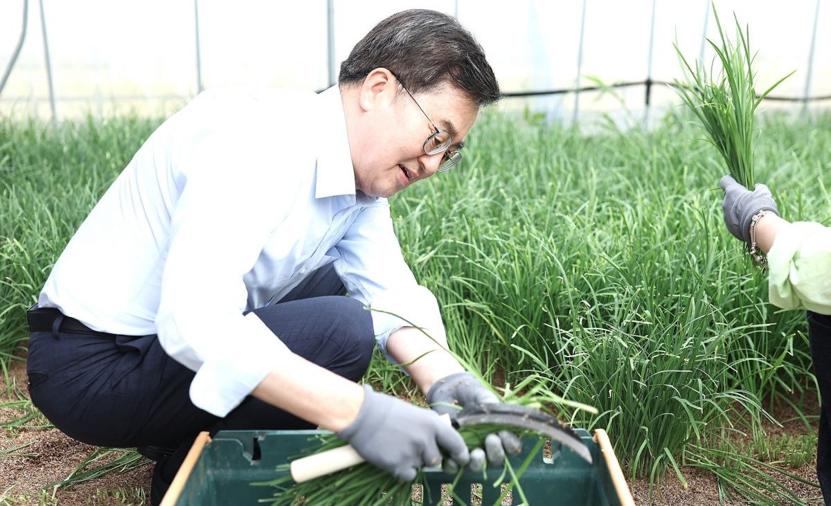 김 지사는 생산자, 학교급식 학부모 모니터단, 영양교사들과 부추 수확 및 포장 작업을 함께하며, 친환경 농산물의 생산 과정과 품질을 직접 확인했다.
