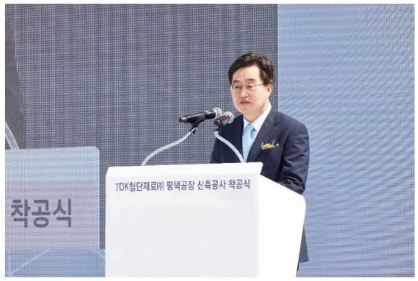 김동연 경기도지사가 지난달 20일 민생경제 현장투어 첫 일정으로 TOK첨단재료 평택포승공장 착공식에 참석해 축사를 하고 있다. 경기도 제공